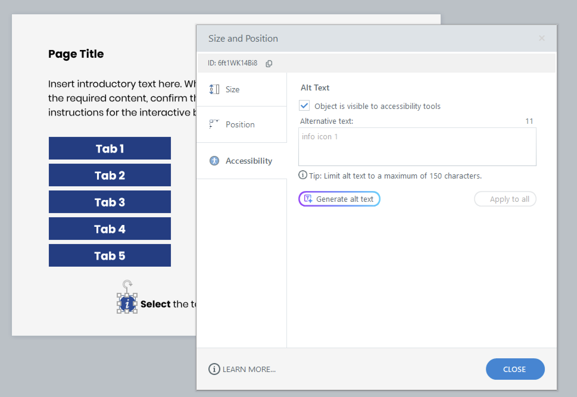If you use a decorative icon (like the info circle), remember to right-click the icon, select Accessibility, and untick "Object is visible to accessibility tools." This prevents screen readers from announcing unnecessary decorative elements, making the experience much smoother for learners using assistive technology.