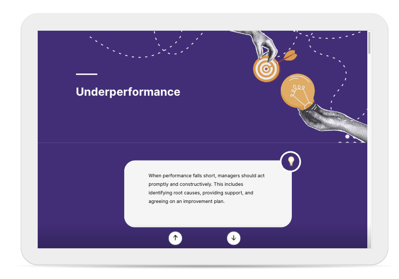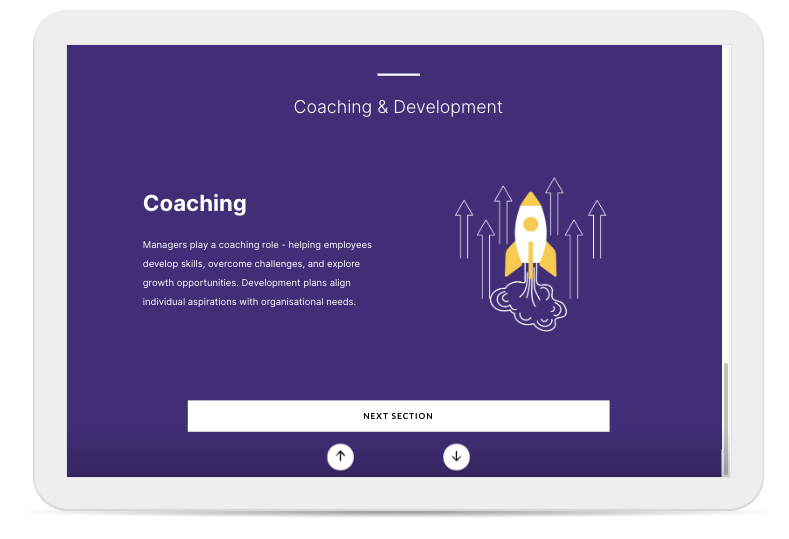 Microlearning in Rise is designed for vertical scrolling, with smooth navigation using animated arrows rather than the traditional left-hand menu. I showcase a microlearning example on performance management, a common corporate training topic.
