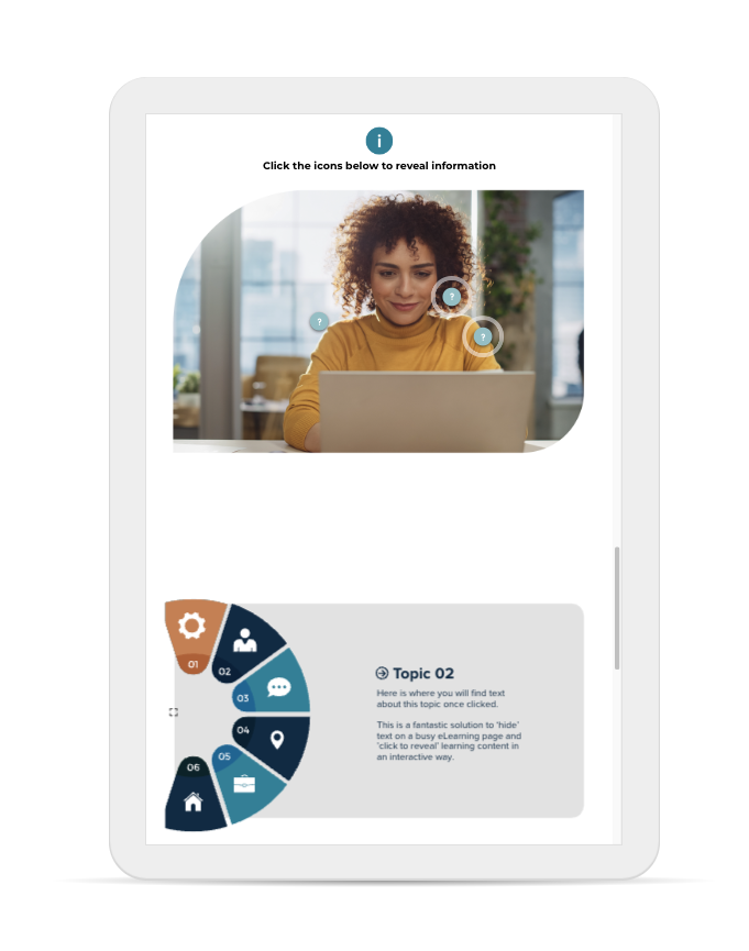 In this example, the background is transparent so it blends into the Rise build. The top sample is a Labelled graphic within Rise, the bottom is a custom infographic created in Storyline with click to reveals and animations. As you can see this is a really simple way to present text and add larger, chunkier paragraphs.