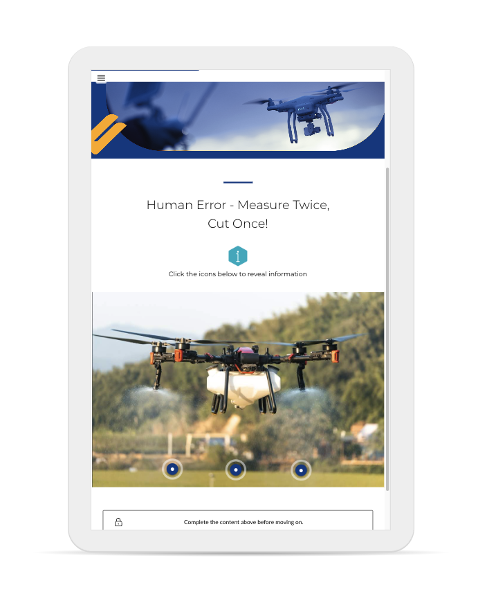 Uncrewed AviationBolde Learning were engaged to create a fully branded and functional eLearning SCORM for Uncrewed Aviation, a provision of Surf Life Saving Queensland. The modules were centered around achieving a drone license and drone safety. Slide 1 Slide 1 (current slide) Slide 2 Slide 2 (current slide) Slide 3 Slide 3 (current slide) Slide 4 Slide 4 (current slide) Slide 5 Slide 5 (current slide)